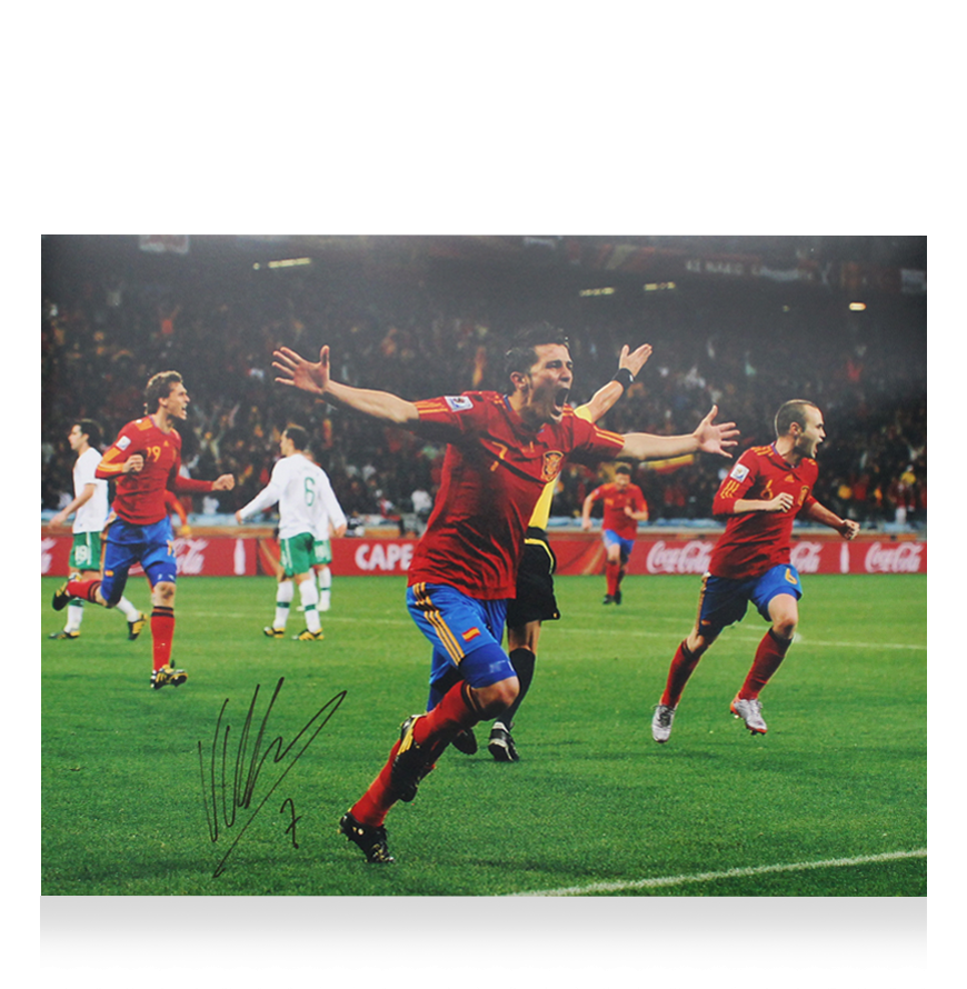 Deze Spanje foto is persoonlijk gesigneerd door David Villa. Het item wordt geleverd met een officieel ICONS echtheidscertificaat.