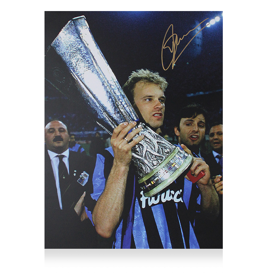 Deze Internazionale foto is persoonlijk gesigneerd door Dennis Bergkamp. Het item wordt geleverd met een officieel ICONS echtheidscertificaat.