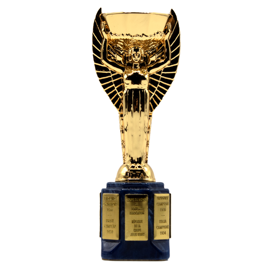 De officiële miniatuur replica van de FIFA WK Jules Rimet-trofee is 100 mm hoog en wordt geleverd in de officiële FIFA WK Jules Rimet-verpakking.