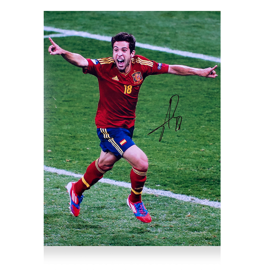 Deze 2012 Spanje foto is persoonlijk gesigneerd door Jordi Alba. Het item wordt geleverd met een officieel ICONS echtheidscertificaat.