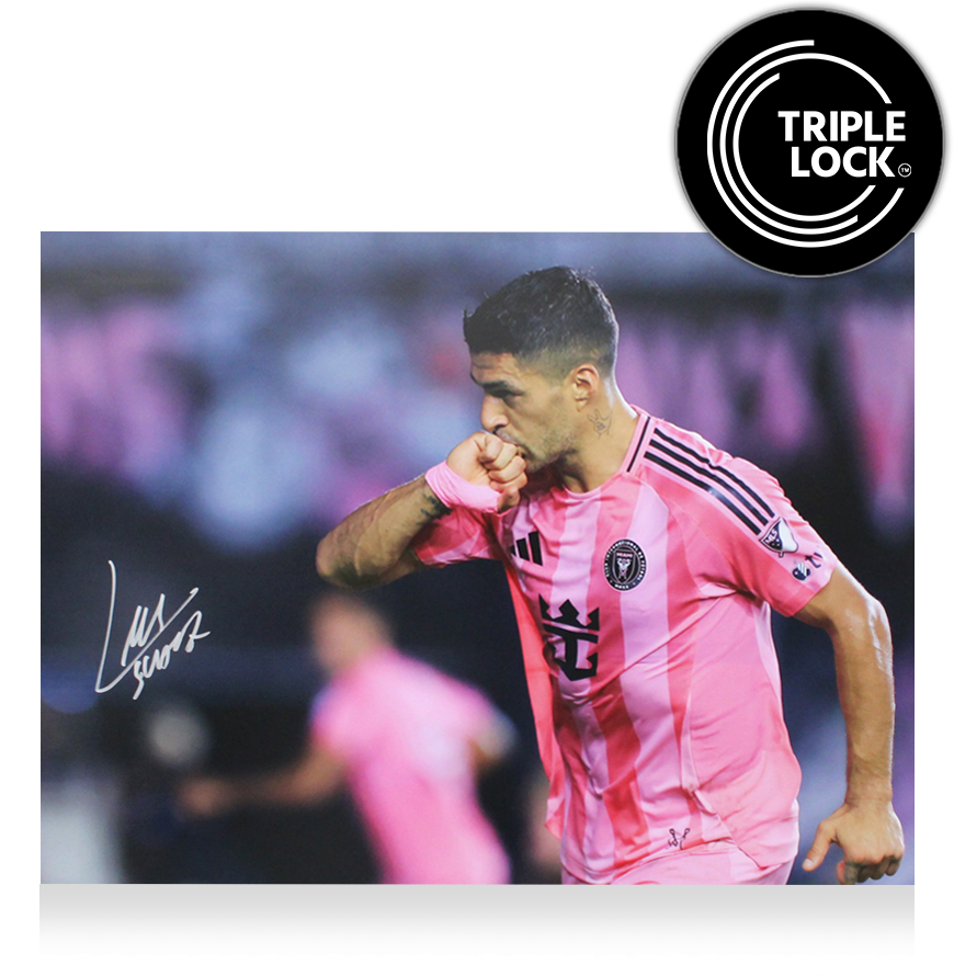 Deze Inter Miami CF foto is persoonlijk gesigneerd door Luis Suarez. Het item wordt geleverd met een officieel ICONS echtheidscertificaat.