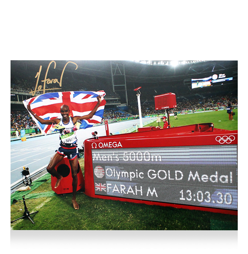 Deze 2016 foto is persoonlijk gesigneerd door Mo Farah. Het item wordt geleverd met een officieel ICONS echtheidscertificaat.
