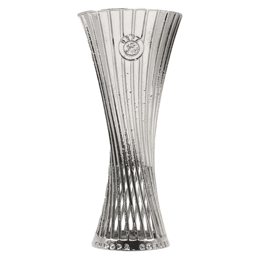 De officiële miniatuur replica van de UEFA Conference League-trofee is 100 mm hoog en wordt geleverd in de officiële UEFA Conference League-verpakking.