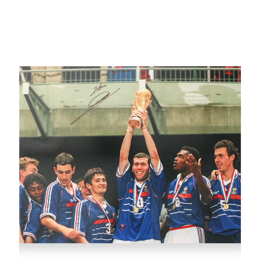 Deze 1998 Frankrijk foto is persoonlijk gesigneerd door Zinedine Zidane. Het item wordt geleverd met een officieel ICONS echtheidscertificaat.